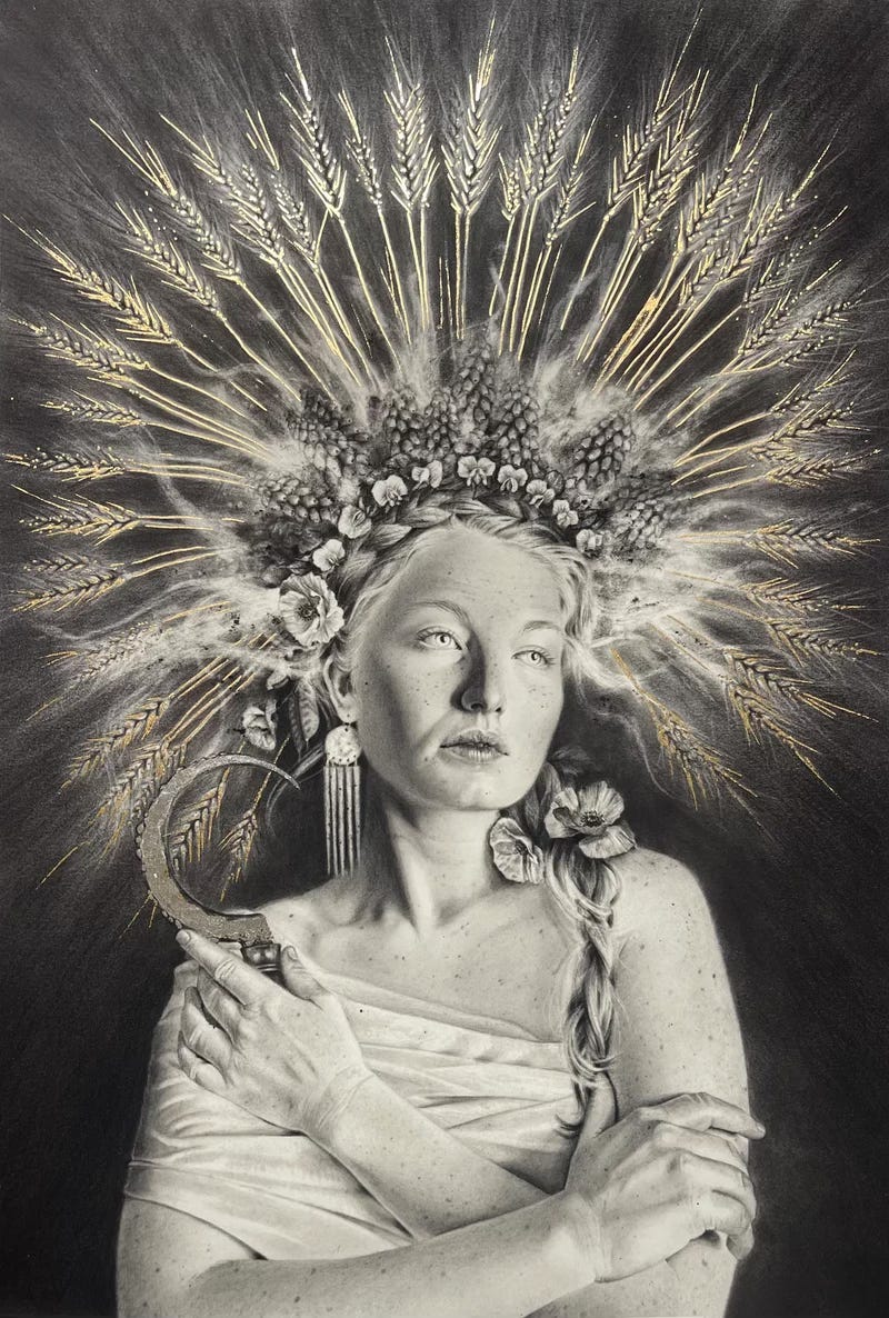 Wear the sun in your crown. Grow pregnant with the moon. Trust the message from the mother -the Great Mother. She is seeking the Kore in you -the young maiden -the maiden becoming priestess. The maiden becoming Queen. She seeks the ripening fruit that you have become. To become more whole. Holy. Re-birthed. Like Daughter like mother. Like Mother like daughter. The one below merges with the one above. The one above merges with the one below. They cast a new song. They have grown deeper. Wiser. The below the below has ensouled them. The long stark winter, it too has carved something. The Cycle of night. Winter. The Scythe. The Sickle. The blood too has been transformed. By Mother. By Daughter. By soil. Because it has been plucked. Because it has ripened. Because it has fallen. It was made for initiation. It was made for rites and cycles. Seasons and seasonings. It was made to shine. To remember. To rise. To strengthen. To know Self. Not just be a self.